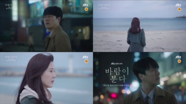 ‘으라차차 와이키키 2’ 후속으로 오는 5월 27일 첫 방송되는 JTBC 새 월화드라마 ‘바람이 분다’(연출 정정화, 극본 황주하, 제작 드라마하우스·소금빛미디어)가 29일, 감수성을 자극하는 2차 티저를 공개했다. 앞서 공개된 1차 티저 영상에서 로맨틱한 케미를 발산했던 감우성과 김하늘은 180도 달라진 아련한 분위기로 가슴을 저릿하게 만든다.
