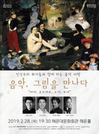 ▲음악, 그림을 만나다의 포스터     ©정다운 해운대문화회관(관장 권창오)은 2월 ‘문화가 있는 날’을 맞아 28일 해운대문화회관 해운홀에서 <음악, 그림을 만나다> 공연을 개최한다.   음악, 그림을 만나다는 ‘인상주의 화가들과 함께 하는 음악 여행’을 주제로 아래 해설과 인상주의 화가 마네, 르누아르, 드가, 모네의 작품들 그리고 뮤지...